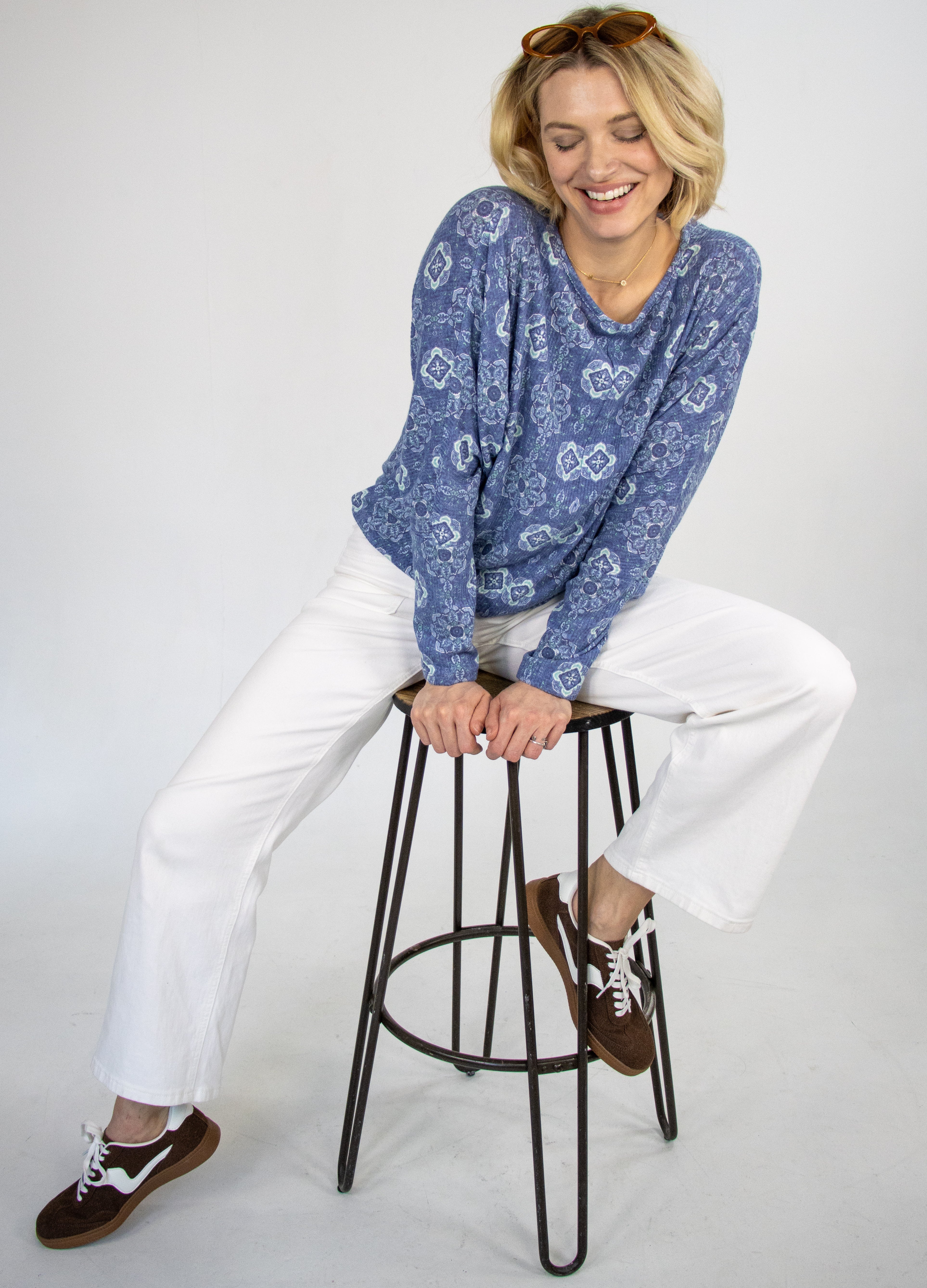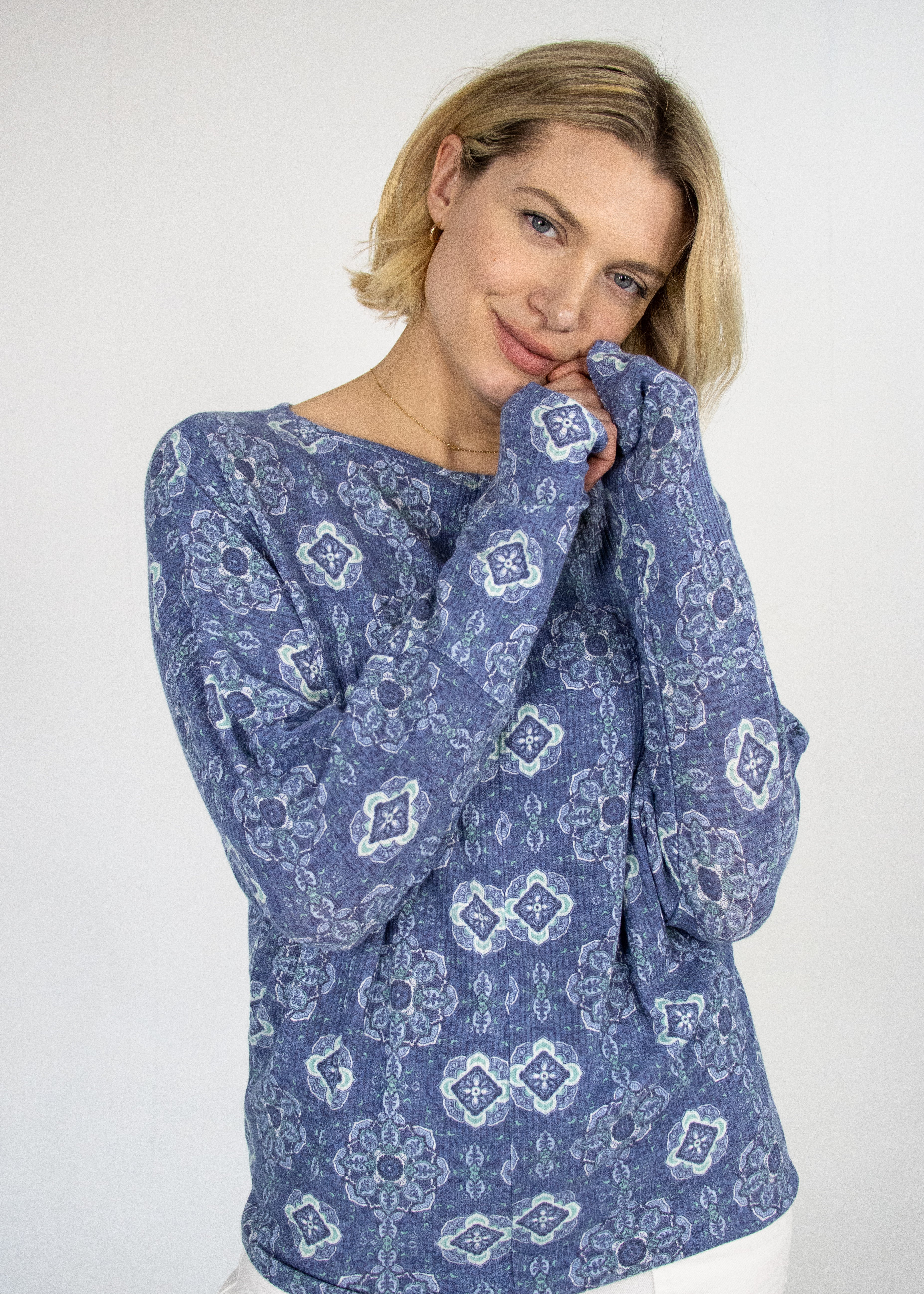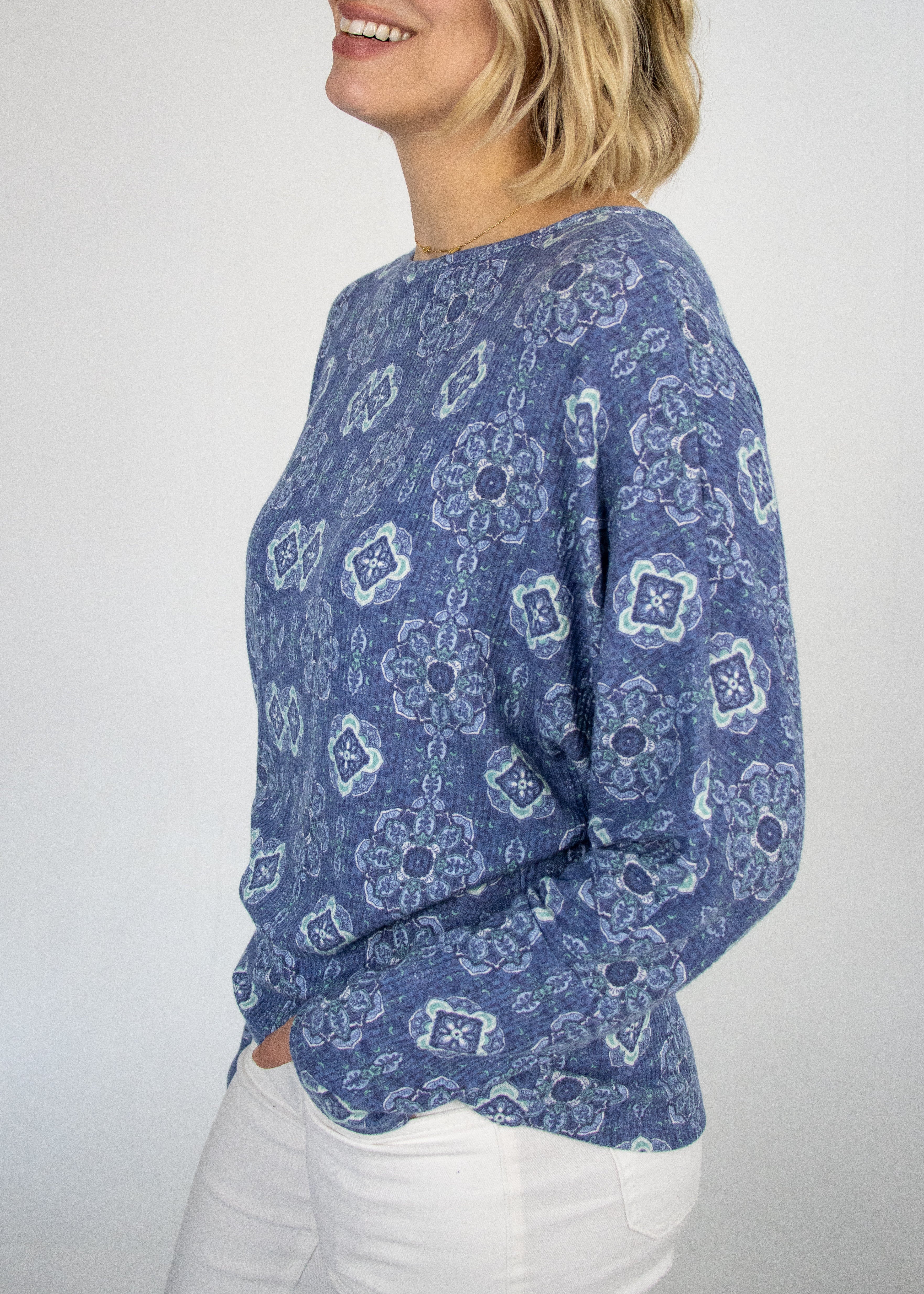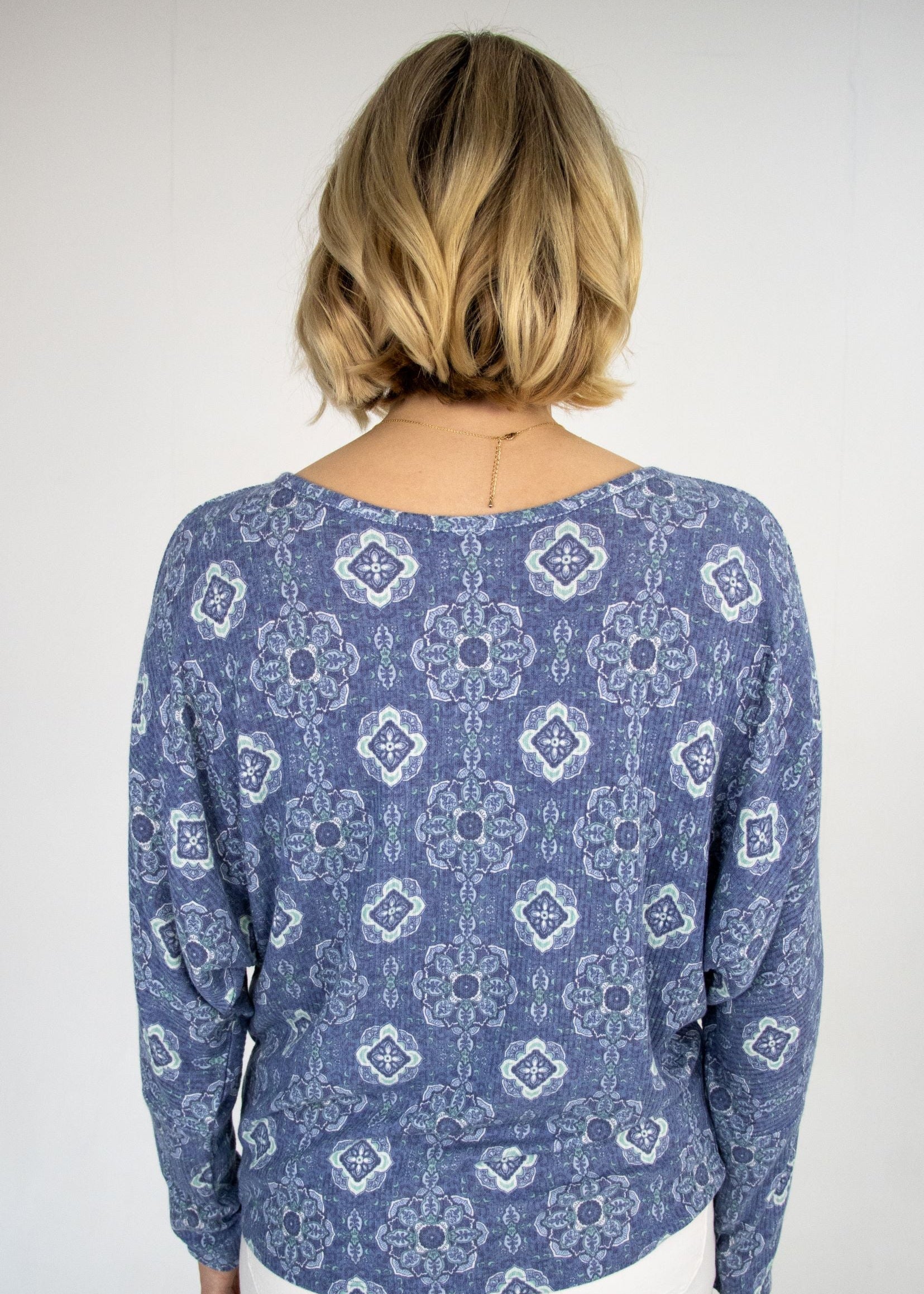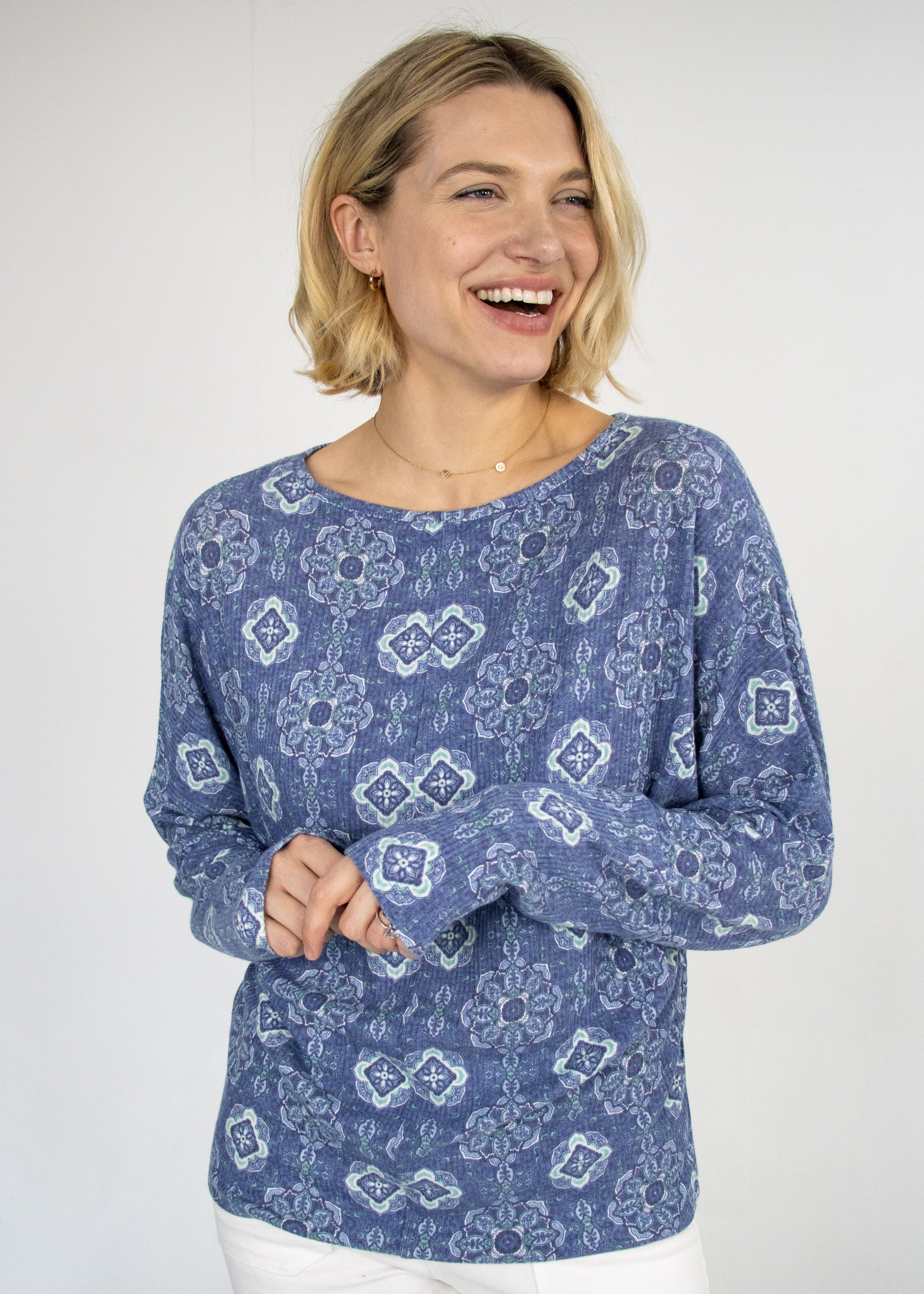 Embrace comfort with a twist in our Tammy Denim Tile Dolman Top. This eye-catching top features an intricate all-over medallion and geometric pattern in varying shades of blue, creating a captivating pattern. Designed for ultimate comfort, this top boasts a relaxed, generous fit with dolman sleeves that drape beautifully, offering an effortless silhouette. The wide, rounded neckline adds to its comfortable yet fashion forward appeal.